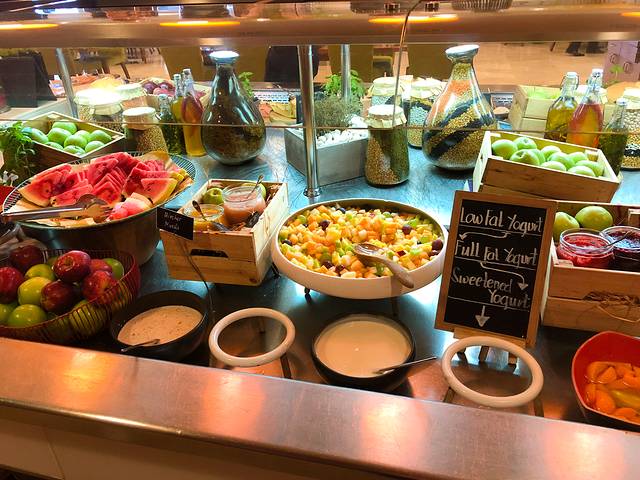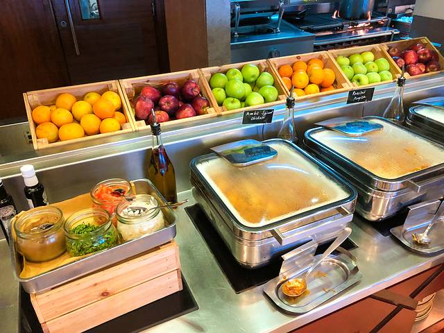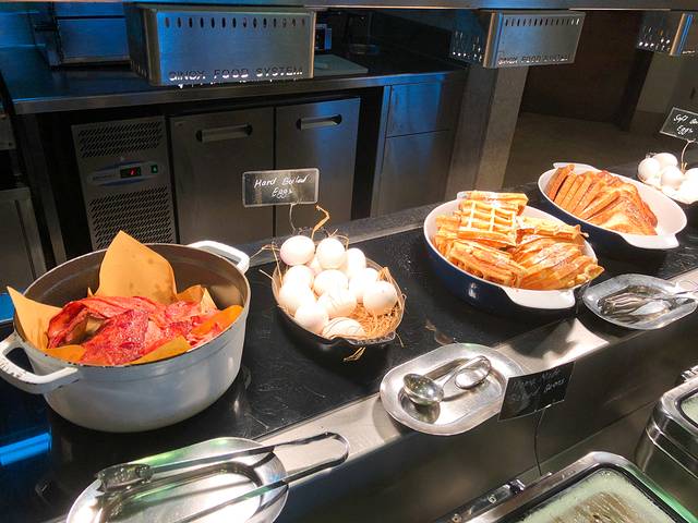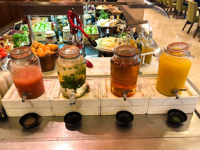 说到饮食,很多人关心,带着这么小的孩子出去,孩子会不会吃不好啊怎样的,其实完全不用担心这个问题,我们先说一下早餐。两个酒店的早餐自助餐都蛮好的。各种各样的搭配琳琅满目,因为是自驾游自由行,你可以睡到9点再起来吃早餐也没问题。