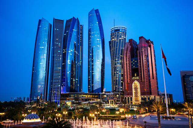 站在酒店台阶上拍摄的对面的大厦,阿提哈德塔也在其中