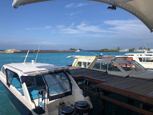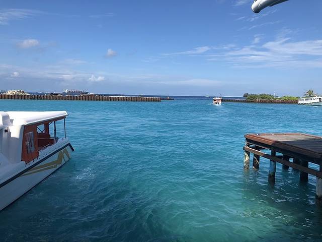 快艇上岛的地方。其实, 马累 这里的水就已经很蓝很蓝了。像 澳大利亚 大堡礁 的 圣灵群岛 。 圣灵群岛 也就是这种蓝,一样有好多好多游艇和船停泊在岸口。听说芙花芬这样离得近的快艇岛都是在这里出发,一路上看到这样的蓝心情也会好很多的。而且这几天的 马累 一点儿也不热,像是刚刚有过一场倾盆大雨过后的凉爽,吹着海风,淡淡的海腥味,加上如此美景,心情已经开始HIGH起来啦!!~~