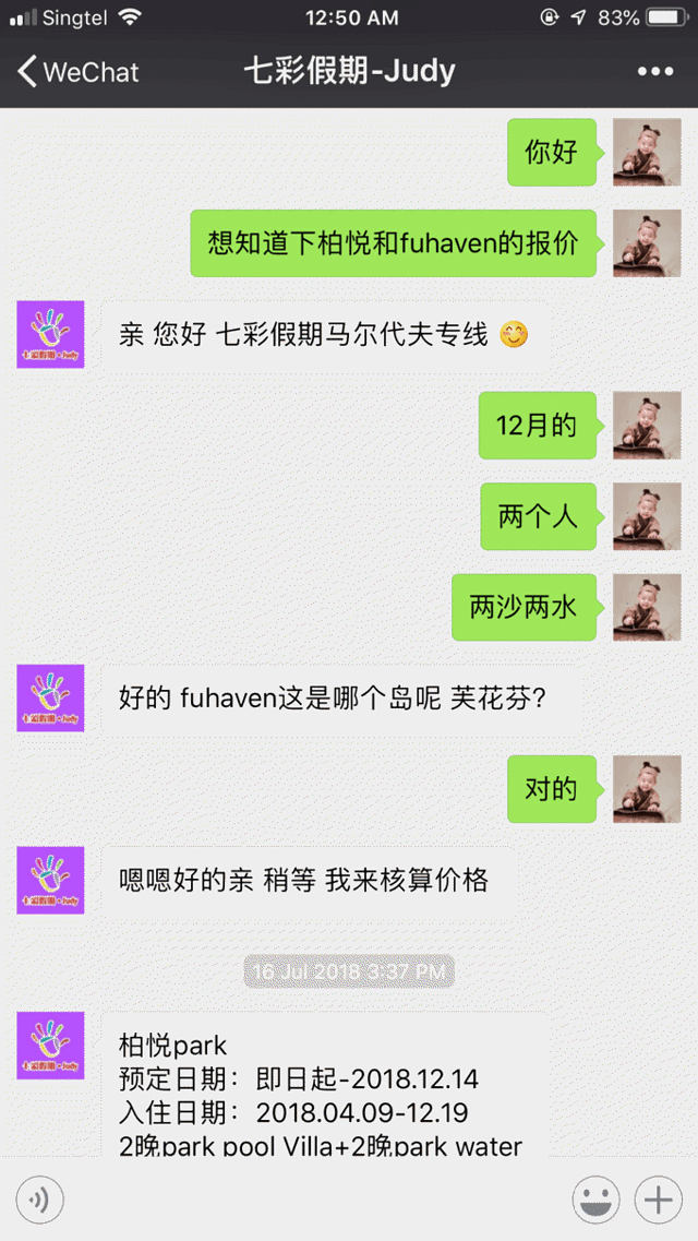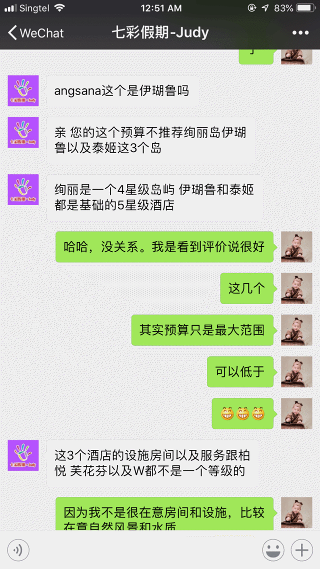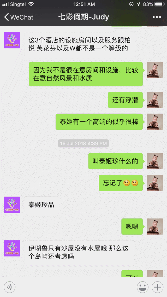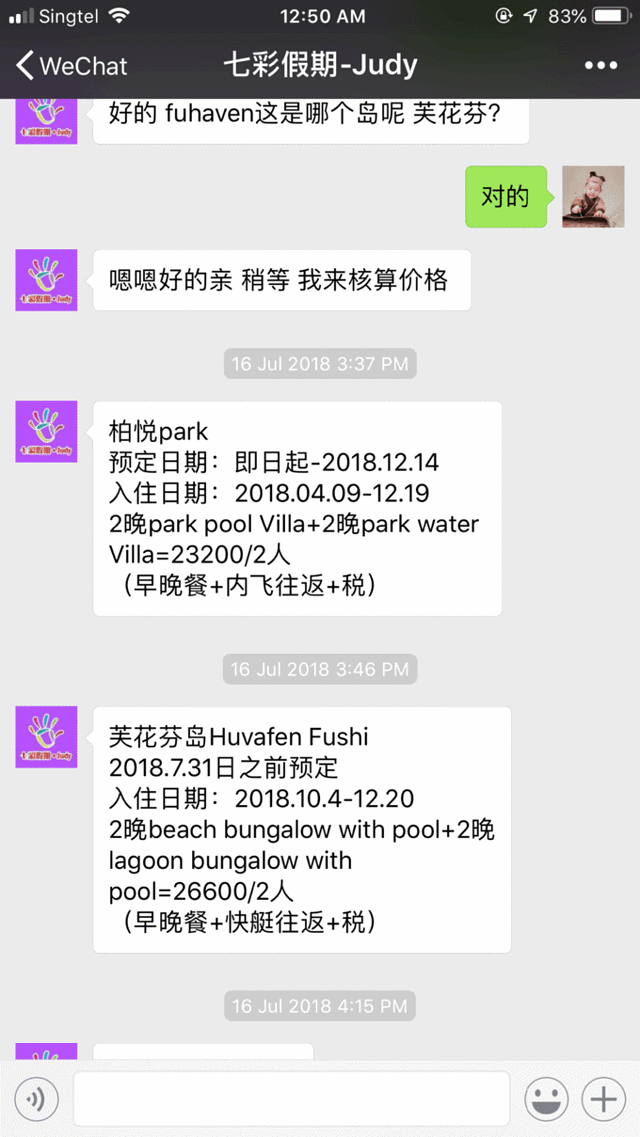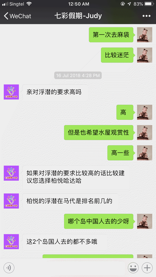 最后选择柏悦主要还是因为浮潜,听说水屋每一个都离海沟不远而且水质非常好,很容易看到BABY SHARK和小海龟还有魔鬼鱼。而且果真看到了最后!!!可惜我老公没有看到小海龟,因为好几次我和他都是朝不同方向游,我是个做极限运动时候超级不喜欢有人陪的人吼吼吼离题了……先晒几张和七彩假期的客服小JUDY的对话吧~~~