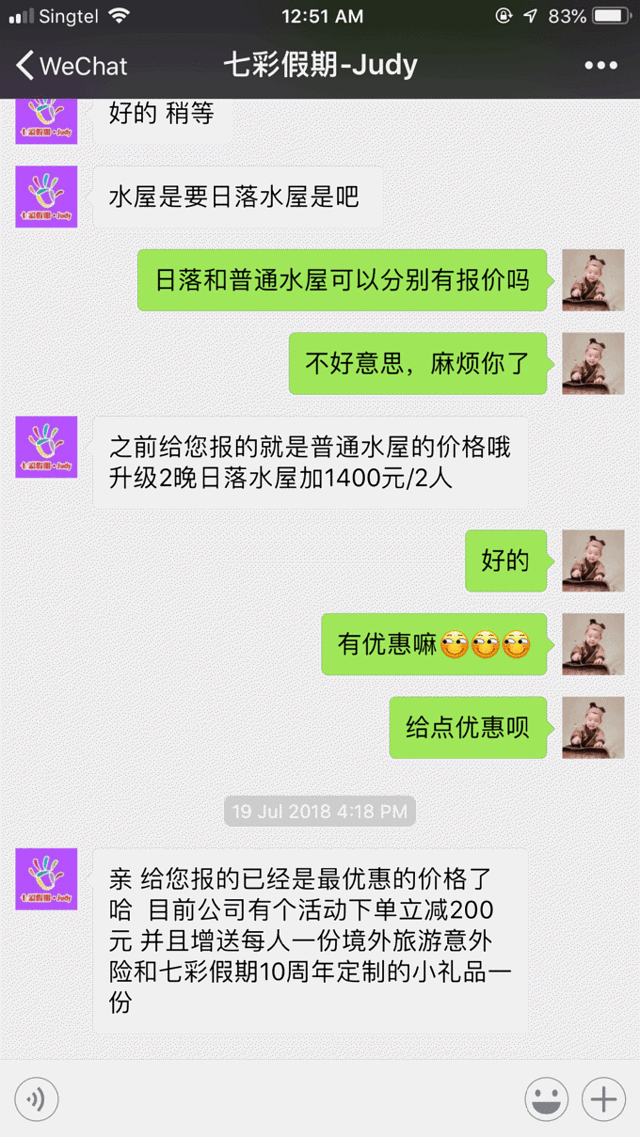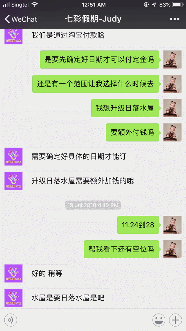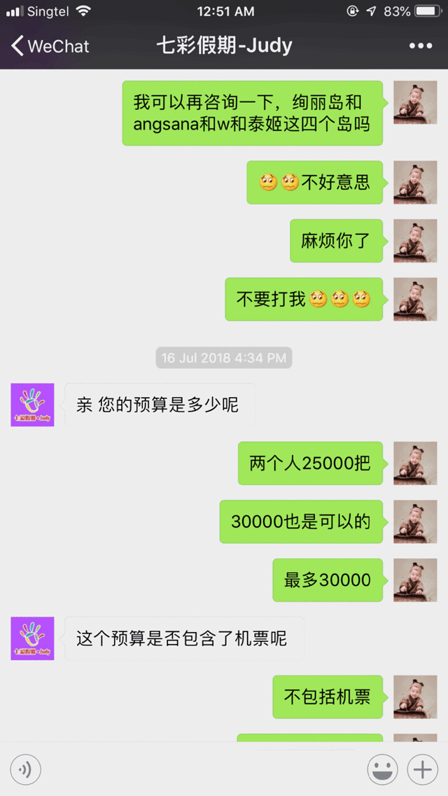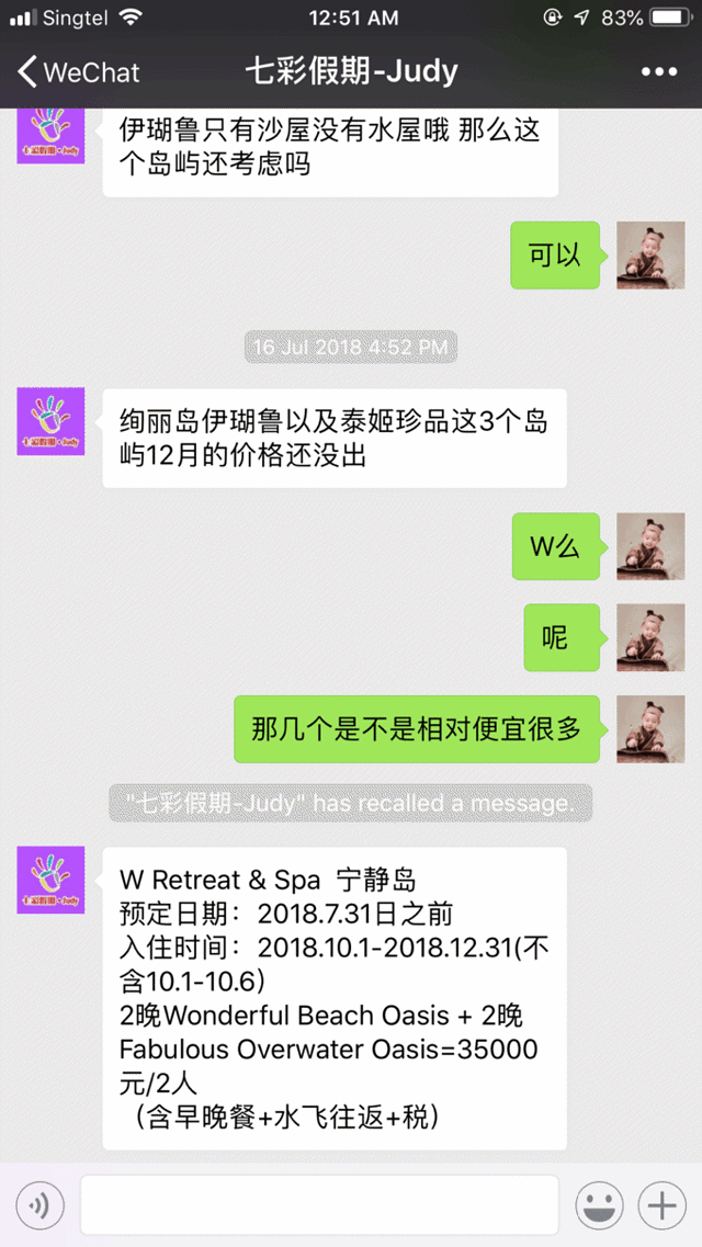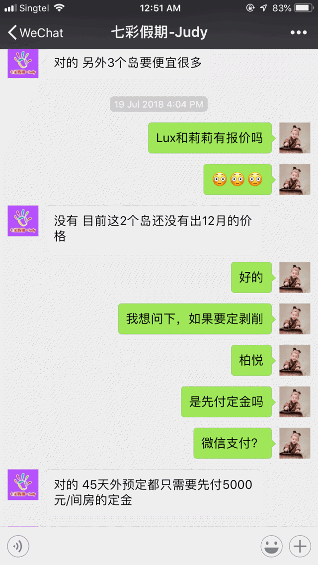 最后选择柏悦主要还是因为浮潜,听说水屋每一个都离海沟不远而且水质非常好,很容易看到BABY SHARK和小海龟还有魔鬼鱼。而且果真看到了最后!!!可惜我老公没有看到小海龟,因为好几次我和他都是朝不同方向游,我是个做极限运动时候超级不喜欢有人陪的人吼吼吼离题了……先晒几张和七彩假期的客服小JUDY的对话吧~~~