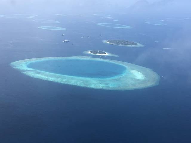 想到了高中课本里曾经用“ 印度 洋上的眼泪”形容 马尔代夫 ,真是太恰当太形象了。在飞机上看,一个个心形小岛错落有致地展现在眼前,远处的小岛就是一个个珊瑚礁,从深蓝岛浅蓝非常有层次的渐变,很多蓝色和里面的细节相机拍不出来,但是超级美!!