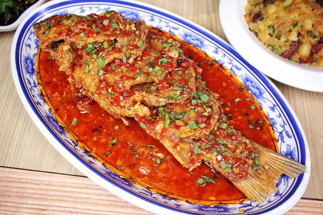 柒食的炝锅鱼用贵州的糟辣椒做的,外面炸成了脆皮,里面的鱼肉还是嫩的,撕下来沾上糟辣椒的汤汁,一点鱼腥味都没有,可以说是比较有贵州特色的吃鱼方式了。