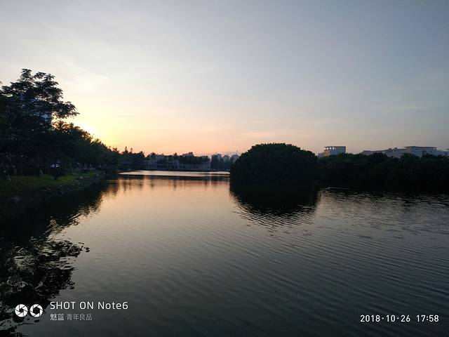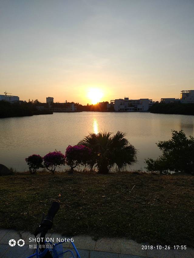 海南大学,属于综合性大学,校园交流丰富,有电平车观光与接送,相当人性化,值得借鉴学习,校园并不算太大,我没有骑完,共有5个门,东门我正在的门,南门就大家所关心的小吃街,相当热闹与繁杂,新南门是跨海甸溪著名世纪大桥那个门,北门紧联白沙门公园,西门没去。东门进去正对校园湖心小岛,那时已近夕阳,残阳下湖面泛着晶莹剔透,折射在小岛茂密的树林中,隐约可现,格外迷人。沿湖一周可转回来,我边走边骑边欣赏这湖光山色的美貌,那透着绿色气息芳香,那可亲的校园,仿佛置身于我的学生时代,校园内三三两两,一群一群的学生和游客漫步/我漫无目标骑行,被学校纷繁复杂,乱七八糟的校园小路弄糊了,不知该如何走出去,只好请教学生才出去南门小吃街,这时时天色已暗,马路上灯光亮起来了,周边的商铺异常明亮,也非常热烈,什么味道都一古脑钻进鼻孔中,夜越来越深,光越来越强,气氛更加疯狂,我跟着美团寻海南粉,那新鲜感也稍纵即逝,没有那么特别的。