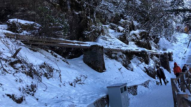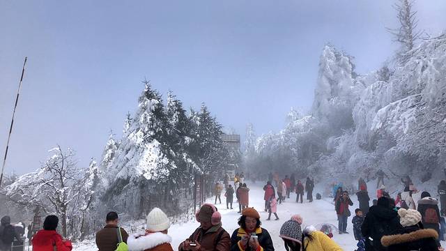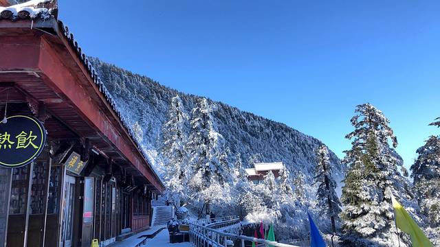 下车后,天还是黑色,我穿了羽绒服,1月的峨眉山积雪覆盖。在峨眉山站是有官方的旅游大巴,直接开往雷洞坪的,现场也可以买票,不用担心