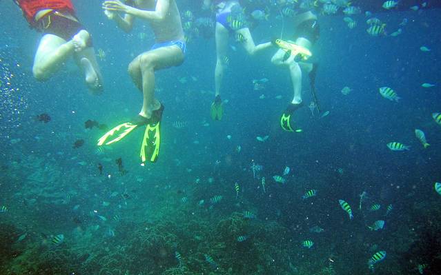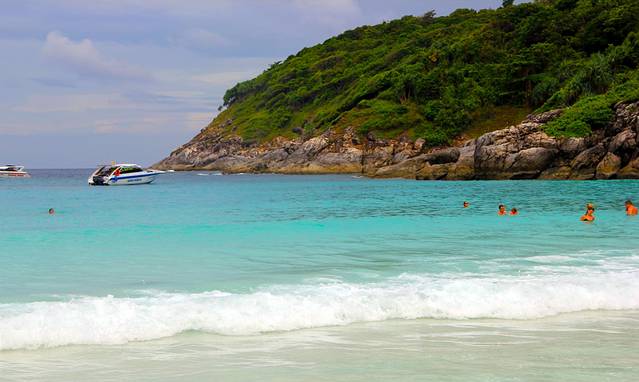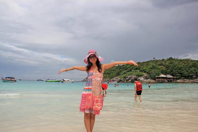 11点半,我们集合,前往Siam海滩。快艇开到Siam海滩区,导游告诉我们接下来要进行浮潜。这里海水深5米,浮潜是直接从船上下去,在附近活动的。穿好救生衣,戴好面镜和呼吸管,开始人生第一次浮潜尝试。