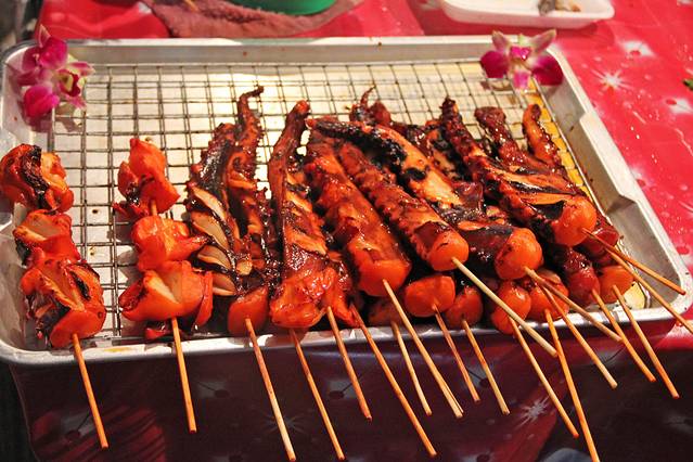 要了鱿鱼串、鸡肉串,还要了猪排面,很好吃,才50b。在夜市买了柠檬味道的香皂,带回去送朋友。
