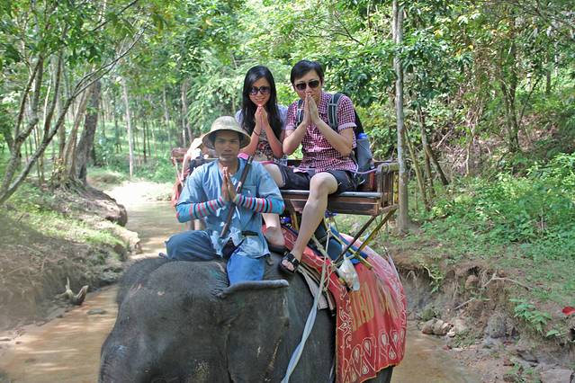 每头大象背上都安装着两个人或者三个人的座位,象夫坐在座位前面,引导大象。刚坐上去的时候会有点小担心,因为确实很高,大象走的时候虽然很慢,但每一步都会颠簸一下。大象一直走的是浅浅的水路,期间也是没法拍照的。会有专门的人给你拍照,象夫说要300b每张,价格实在太高。但象夫们有自己赚钱的办法,他会告诉你直接给他200b,可以帮你多拍几张照片。大部分游客大概都会选择这种方式吧。