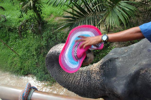 往回走的路上我的草帽不小心掉下去了,象夫马上说不用担心,旁边的象夫接着指挥他的大象用鼻子把帽子卷上来递给我了。