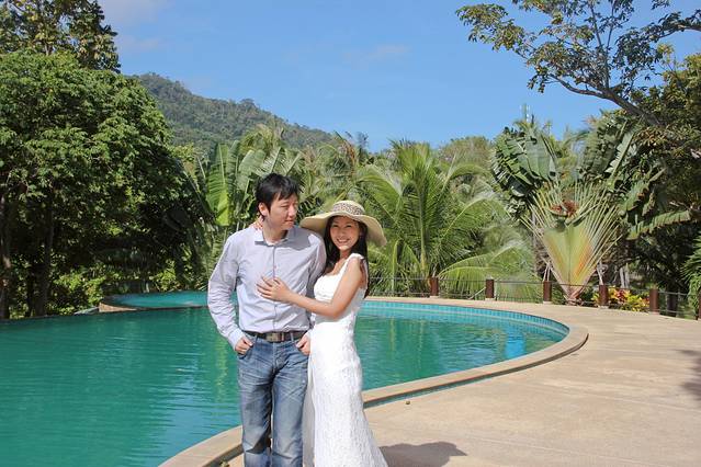 今天是在普吉岛的第四天了~拿出婚纱来拍大片啦!很幸运的遇到了岛上三个东北小姑娘,人特别热情,很热心的给我们拍了好多张合影~