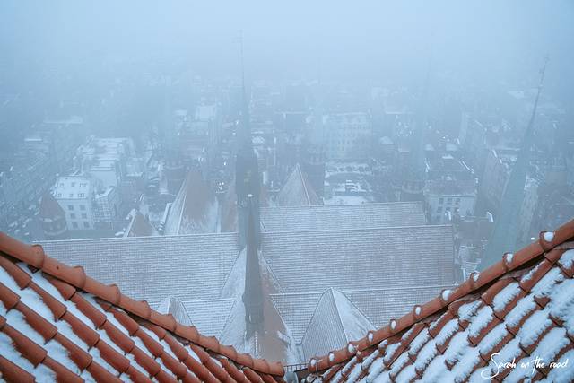 我对首饰一贯没什么兴趣,对风景有着迷之执着,老城的教程顶楼可以看到 格但斯克 老城全景,尽管要爬三百多阶梯,还是义无反顾爬上去了,一开始螺旋式的楼梯走得头晕目眩,后面的楼梯就好走很多,可惜天空不作美,大雾什么都看不清。