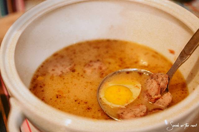 这是地道的 波兰 菜汤。用大麦粉加水发酵后的汁液为基本汤料,加上香肠、熟鸡蛋等等调料,加热制作而成。食用前撒上些许磨碎的辣根,口感酸辛,这是 波兰 的酸辣汤,不过我还是有点吃不惯浓汤,这是当地人很爱喝的汤。