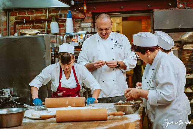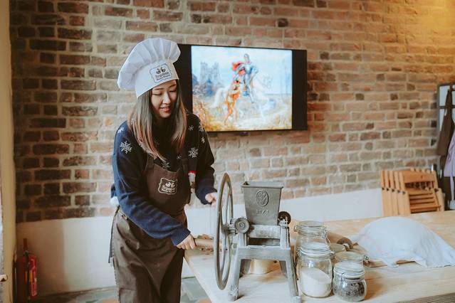 制作一个羊角包还挺费功夫的,我们同一时间段的游客一起协作,每个人制作一个步骤来一起完成羊角包,首先就是和面,需要力气大,几位男生都笨手笨脚的,合格的还是这位妈妈。