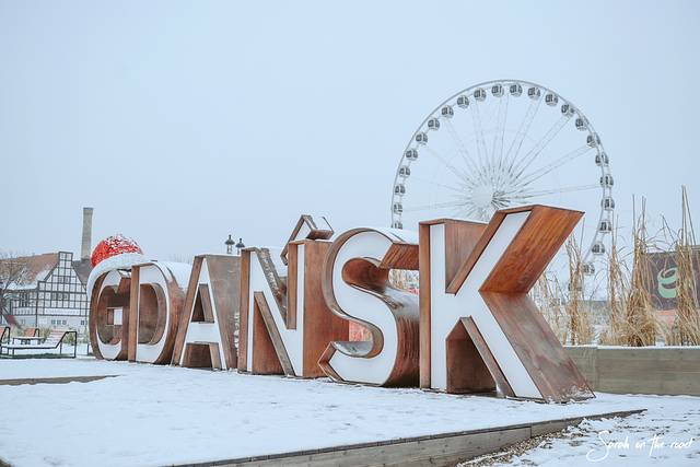 沿着河漫步,两岸是老城古色古香的建筑,快走到出 海口 ,这里有个摩天轮和 格但斯克 的英文字母标志,可爱的是还给她带了圣诞帽。