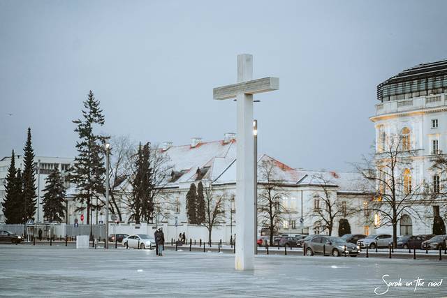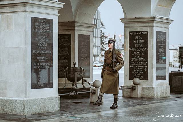 华沙 的第一站,来到位于胜利广场的无名烈士墓,无名烈士墓存放着从战场上收集来的泥土,墓上刻着战斗过的地点与日期。两名卫兵在严寒中坚守着燃烧着的火焰,纪念在建国中牺牲的那些人们。
