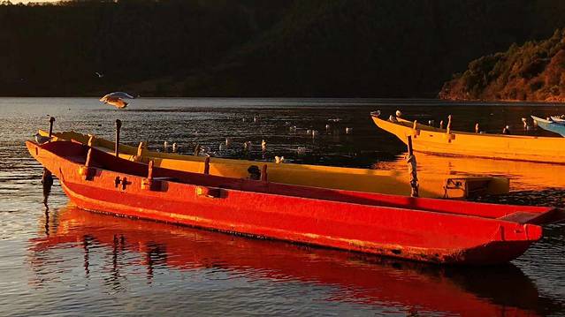 泸沽湖的彩虹色猪槽船是最多的地方,一艘一艘色彩鲜艳的猪槽船整齐的码在岸边,和船后的山水融合在一起,增添了浪漫气息,十分适合拍照。