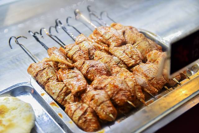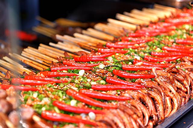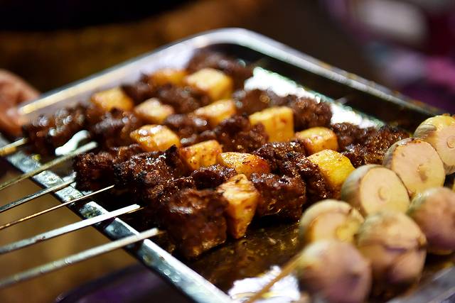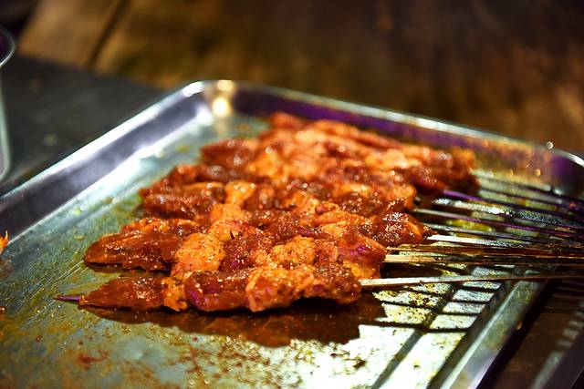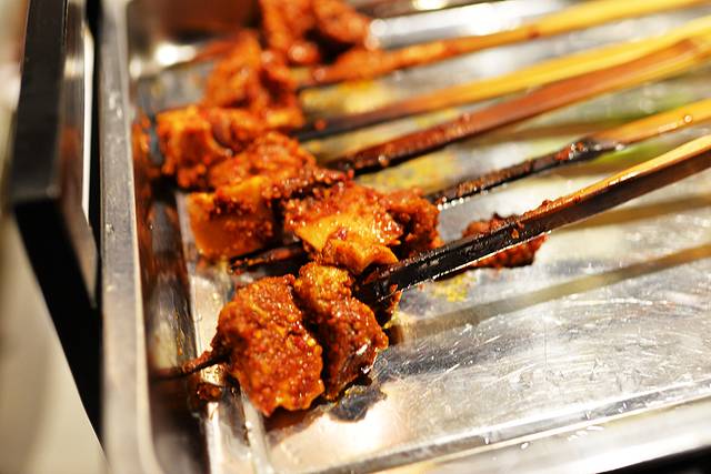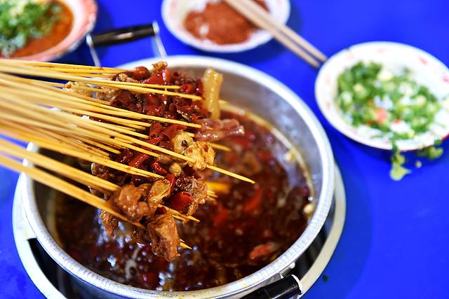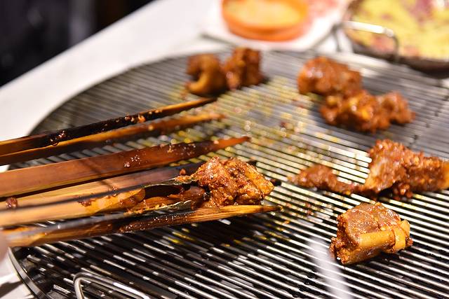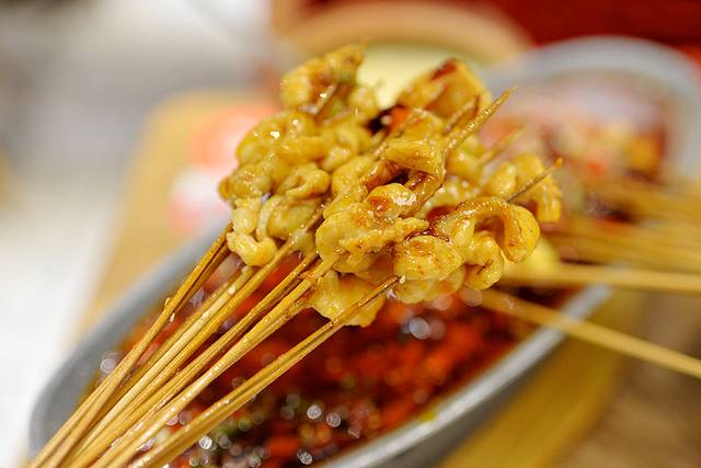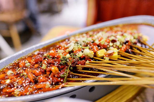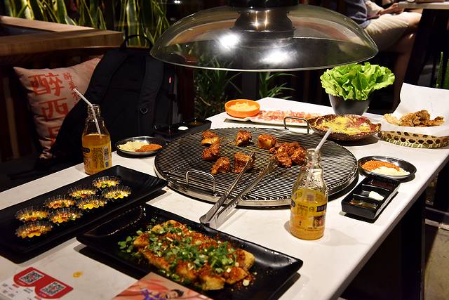 吃的方面,竹签大串基本每桌必点,肉大签子大。肉提前处理腌过,看起来上面满满一层辣椒碎。烤的时侯会有服务生有帮忙,烤好的大肉串没有想像中那么辣,但滋味调和得刚刚好,烤好喷喷香。