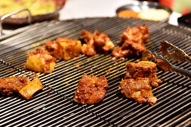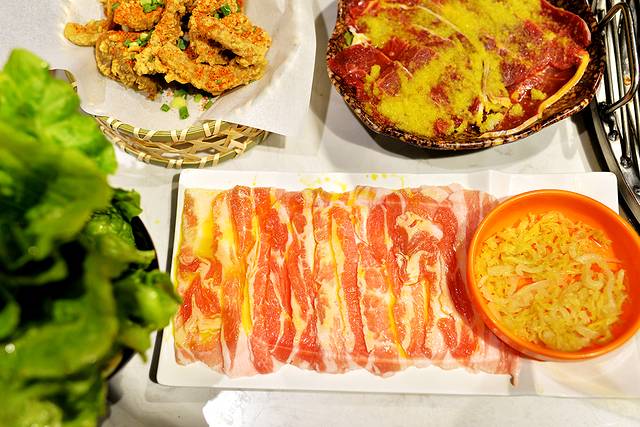菜包牛肉、酸菜五花肉两样都是吃烤肉时我的大爱,碳火烤过,油分都被逼出去,配上酸菜,用生菜叶包好,一口一包,吃得酐畅。
