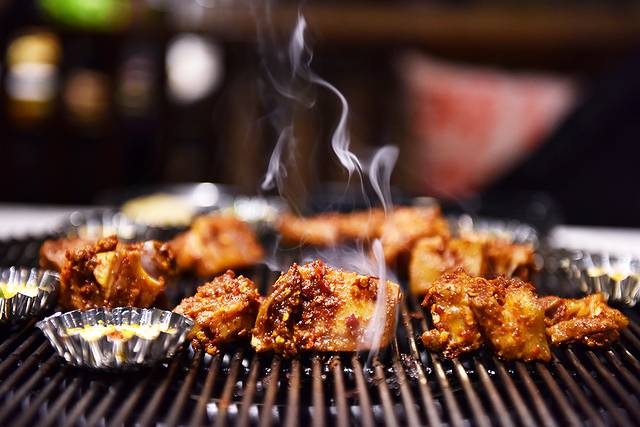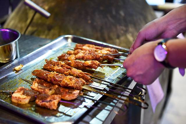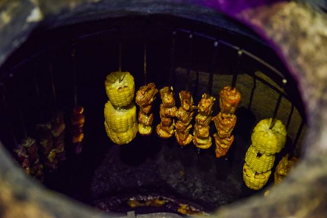 同样是烤肉,但它家不是普通的烧烤,不用明火或电炉,而是采用的更能锁住水分,保持食材高水准的挂炉焖烤。食材提前处理好串成大串,一条条整齐的挂在焖烤炉内壁,高温,密封,焖烤,撒料,再烘烤,上桌,一气呵成。