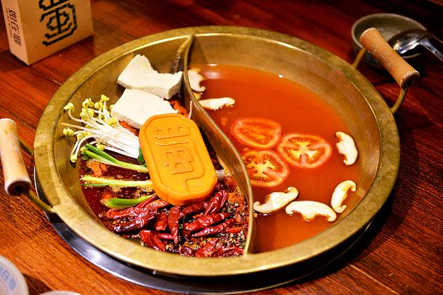 火锅叫的鸳鸯锅底,一边红油,一边茄汁。