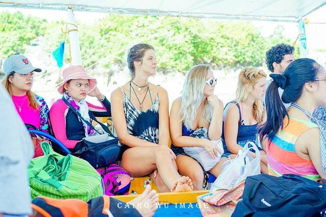 今天的跳岛是昨天在Maya船上碰见的那个人那儿订的。一直游说,不订他都不走,一直说相信他,他是在这里长大的。三十人的大螃蟹船,午餐也会很丰富,鸡肉鱼肉猪肉牛肉,蔬菜水果和饮料都会有的。600P一个人另加每人500P的上岛税。