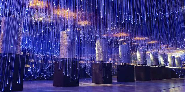 此外,石空国石博物馆有一祈福馆,内特意设置了两排转经筒,让参观者可以从门口一直转到镇馆奇石面前。流线型的灯光垂在馆内,颜色变幻无常。走进馆中,犹如来到了一个梦幻星空。在这里,随时可以拍出在朋友圈刷屏的照片。