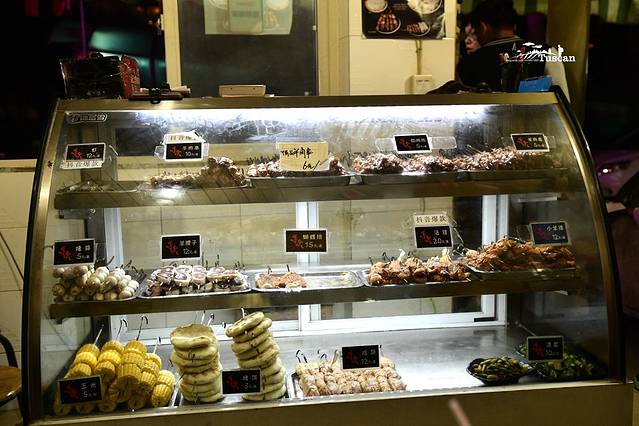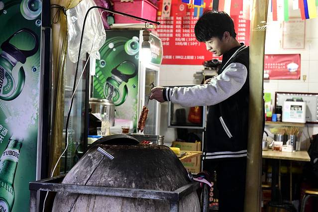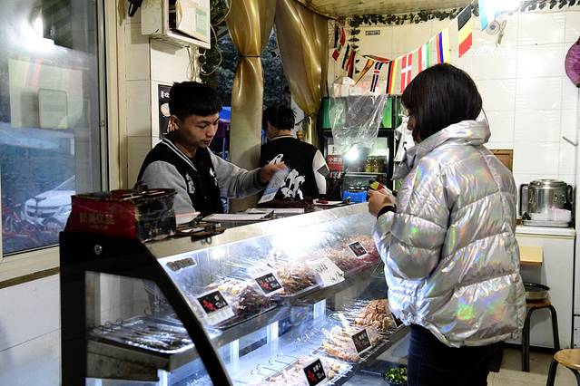 透过玻璃柜子,看到里面的菜品还算丰富,以荤菜居多,除了玉米、锅魁是烧烤中的素食外,时令的凉拌黄瓜和煮毛豆角也摆在里面。