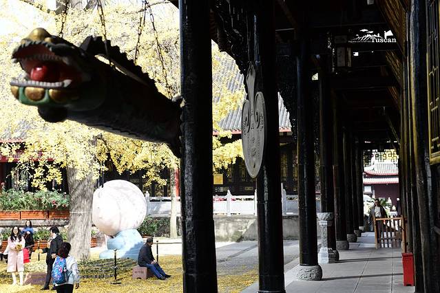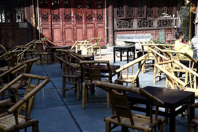 寺里有一个成都人喜欢的老茶馆。红木小方桌、竹子编的椅子,一杯花茶,在阳光明媚之时,完整地勾勒出了成都人最喜欢的休闲时光。