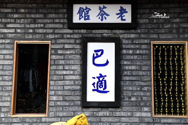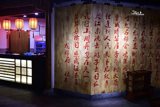 老实说,这家店的装修是很用心,很有品味的。无论墙上的一幅画、一首诗、还是那些青花瓷盘、红木方桌、长嘴铜茶壶,喝水的杯子,都把巴蜀大地的文化展现到了极致。
