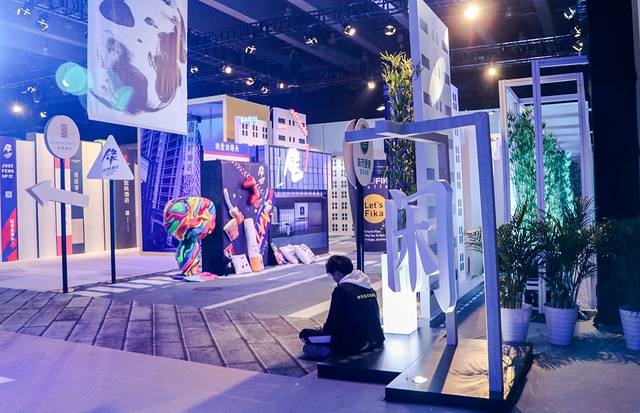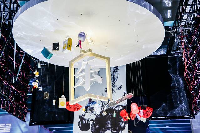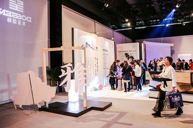“乐”区域在整个会场的正中央,传递欢乐气息,用意是让大家乐在其中。围绕着乐字的是12个子品牌中具有标志性的咖啡杯、杯盘碗盏、梳妆镜、香氛、烟灰缸等物体,装饰特别用心,整体效果很有空间感。
