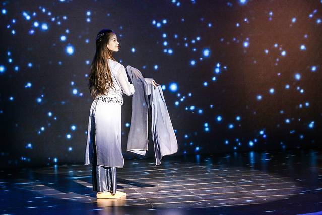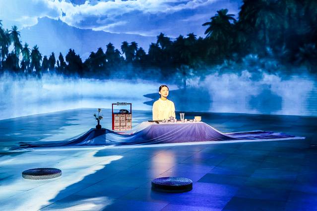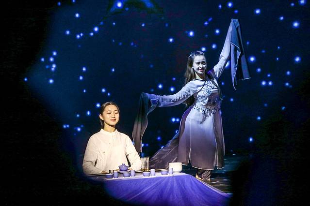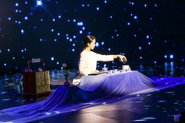 在广阔的宇宙中,上演了一场美轮美奂的现场茶艺表演,洗茶、冲泡、封壶、冲壶等步骤,一步步将茶道文化呈现,伴着星空下跳动着的曼妙舞姿,一动一静,妙趣横生。