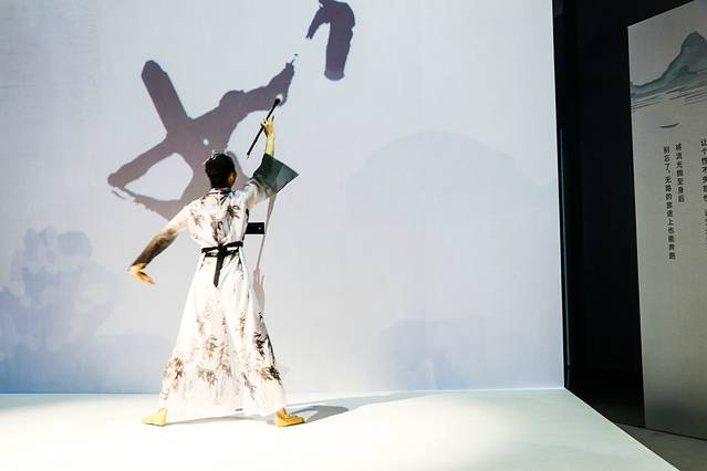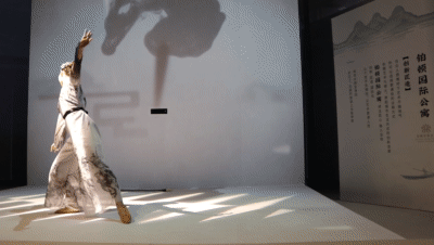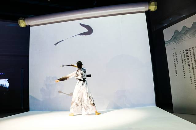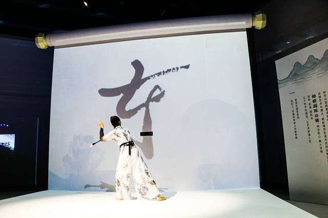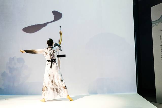 在一幅打开的书卷上,穿着丹青水墨画服饰的美女,献上一段亦柔亦刚的舞蹈表演,大大的毛笔一挥,在屏幕上写下“妙享东方”四字,极具韵味。