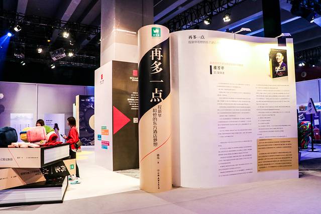 “雅”区域是由一本本巨型的“书本”构成,错落有致,打造出一种读书的氛围,形成了“书巷”和“书楼”。值得一提的是,入口处是一本打开的书页,原来是东呈国际集团董事长兼CEO程新华的新书《再多一点》,这本书讲述了他的东方酒店梦想,也有很多酒店管理方面的经验分享,值得一读!