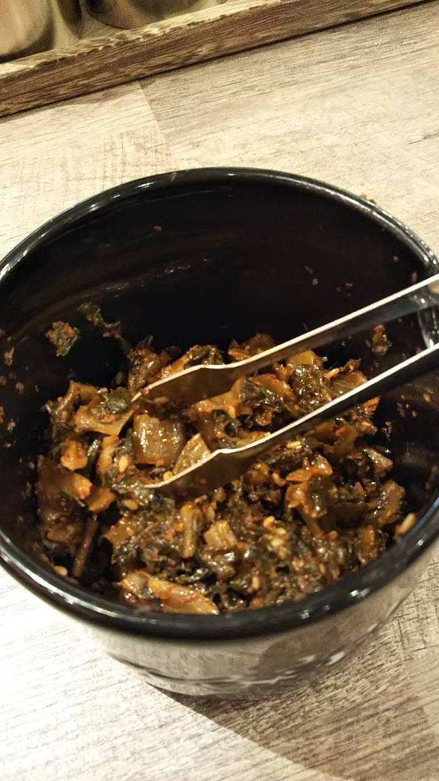 高菜本身是比较辣也比较咸的。被有韧性的芝麻油所缠绕之后,口舌无法直接接触到高菜。高菜的那种辛辣被芝麻油包裹,有失了高菜自我。自我感觉不太配这碗黑拉面。