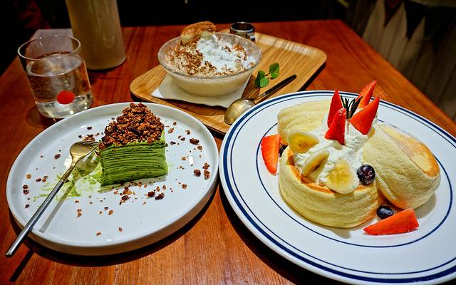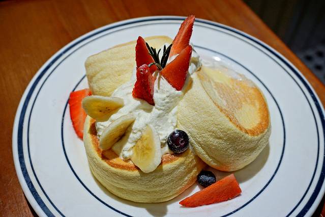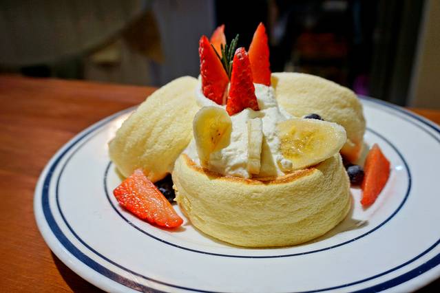 舒芙蕾松饼:选择了草莓口味款,此款甜品有草莓、蓝莓、香蕉三种水果,柔软的面包带有奶香和蛋香味。