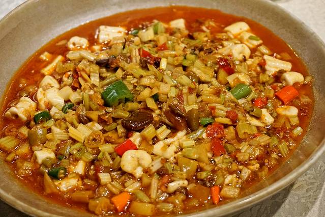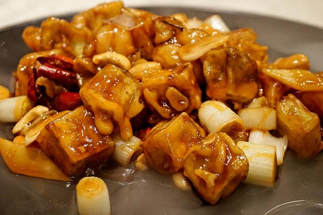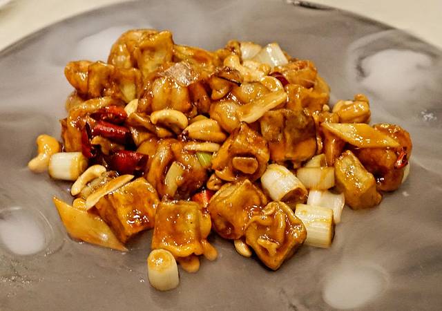 宫保虾球:原来虾还可以这样吃,海鲜做出川菜的味道,餐盘的四个孔是可以冒出仙气的哦。