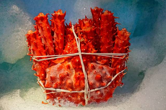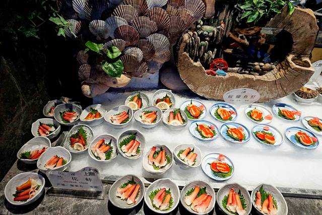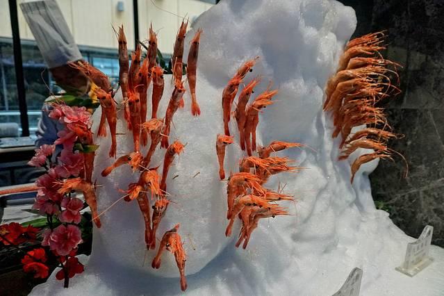 先来看一下来自智利的霸气帝王蟹King Crab,整只的帝王蟹摆放在雪白的山雕上,色泽特别的鲜艳诱惑,烫涮1-2分钟即可入口。