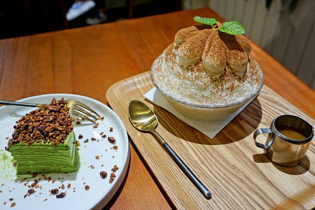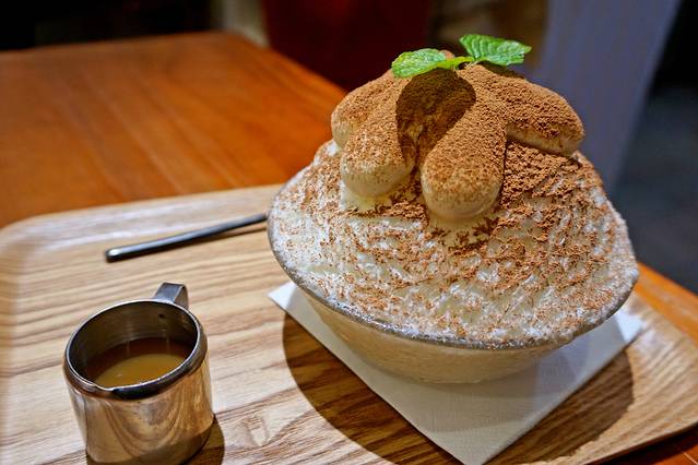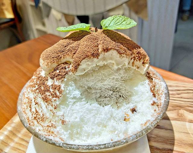 提拉米苏富士山:浓郁奶油芝士雪顶+牛奶味刨冰,雪顶撒上香浓可可粉,还有甜蜜焦糖酱可调味。浓郁带有淡淡咸味的雪顶与下面凉凉的刨冰搭配口感不腻不淡刚刚好,也可以根据个人的喜甜程度添加焦糖酱。
