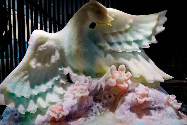 当你走进去的时候会被眼前色彩缤纷的雪雕所吸引,这里的雪山每天会是不同的颜色,当你在愉悦的午餐时这里的雪山在悄悄的退去艳丽色,所以当天的下午会重新给它们上色。