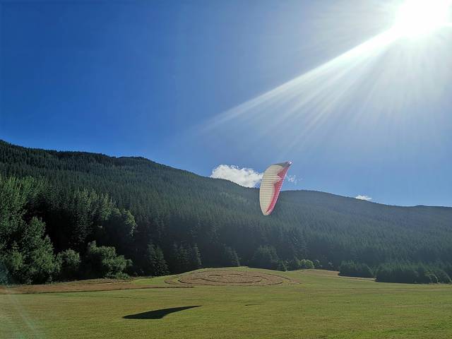 最后一天早上一大早我们就起床开始刷天气预报,8:20收到滑翔伞公司的邮件说还是因为天气原因,今天skyline的山顶不能起飞,但是附近Coronet山顶可以起飞,如果我想去就打电话联系他们。立刻用酒店的电话联系,听声音还是那天接待我的那个小哥,我问他我们下午飞机来得及吗,小哥也不确定,他又去联系,一来二去,8:40分时我终于再次跟小哥联系上他说没有问题10:30就能回到皇后镇,8:50有一班车就要出发了,今天只有这一班车后面风会大起来又飞不了了,问我们10分钟能感到集合地点吗?我瞬间就跟打了鸡血一样,火速去酒店Check out,把行李留在酒店,飞奔向山脚的缆车处,远远就看到小哥穿着橙色衣服在向我招手。几乎是同一时间还有两队外国妹子也赶过来,大家的遭遇差不多,都是飞奔而来就想不留遗憾。车子载着我们开了大概20分钟到了一处山坡,我看到有暂停的缆车,估计可能是冬天的滑雪场,从这里起飞。我和圆圆都是第一次坐滑翔伞,其实还是挺紧张的,大家都说皇后镇是极限运动的发源地,跳伞、蹦极我都没胆量,滑翔伞相对来说还是温和的,伞一打开趁着风势几乎就是从悬崖上原地起飞了,然后越飞越高,感觉几乎与远处的雪山同高,双脚双手悬空,有一种鸟儿般飞翔的感觉。教练问我要不要Higher,我说好,我们飞到更高的地方,山顶都在脚下,然后教练说要不要来点Crazy的,我说NONONO,怂了,慢慢降落到草坪,圆圆已经落地了,他说教练带着他转了360度,我怎么没发现他胆子这么大。