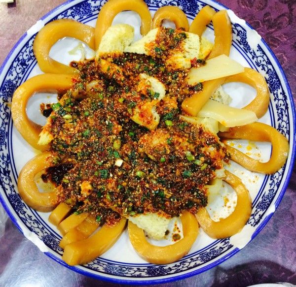 酿皮也是西北地区有名的小吃,有点像凉粉,但又跟凉粉又不一样。青海的酿皮很多是用芋头做的,实际上应该是面粉做的。酿皮吃的时候切成长条,配上面筋,浇上醋、辣油、芥茉、韭菜、蒜泥等佐料,吃起来辛辣、凉爽、口感柔韧细腻,回味悠长。