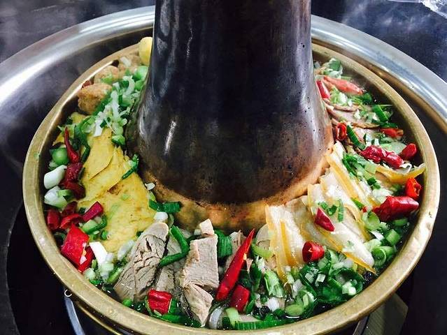 青海土火锅:青藏高原气候寒冷,盛产牛羊,青海土火锅的“锅底”一般由羊肉清汤加少许酸菜制成,口味偏重香辣,不加红油及过多调料,汤色清亮,滋味天然醇厚;尝一口,羊肉的鲜美与酸菜的爽口完美结合,令人齿颊留香,又绝无肥腻之感。