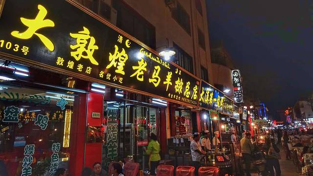 敦煌有有名的沙洲夜市,沙洲夜市位于敦煌市区阳关东路,是到敦煌旅游的人吃饭和购物的地方。这里灯光灿烂,游人很多。有卖水果的、卖工艺品的、吃饭的,分不同的区域。拉面、浆水面、臊子面、陷饼等传统面食,还有敦煌羊杂、烤羊排、烤鱼、羊肉串等风味小吃。更多的是一路溜达过去,都是大同小异的烧烤摊,烤串+啤酒无疑是最好的搭配,味道都很不错,羊肉现切现串现烤现卖。