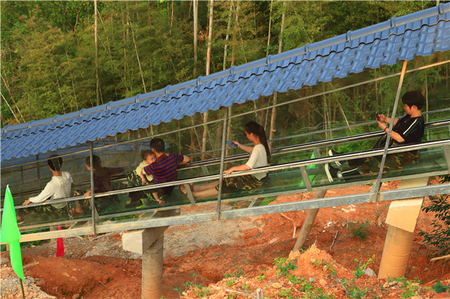 玻璃滑道全程220米,全透明设计,但是景区配备了专门的滑道裤,不用担心穿裙子或者裤子材质的问题,在往下滑的过程中,双脚可以控制速度,遇到拐弯的地方可以助滑,速度更快。