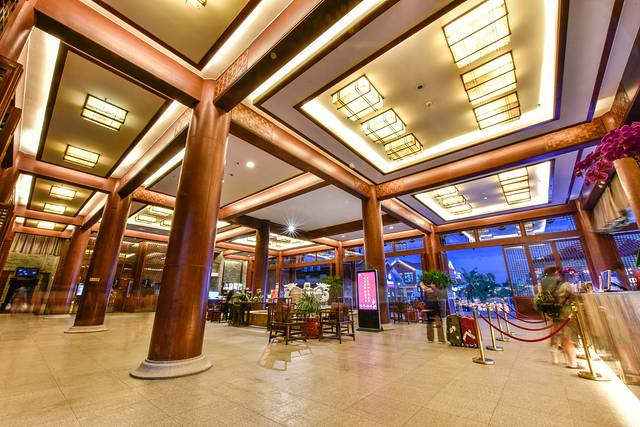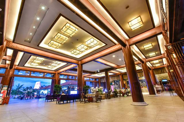 作为三亚最有传统中式特色的酒店,也许是三亚地区唯一的老中式风格酒店了。从大门口即可见到绿色如茵的花园环境,穿越过曲径通幽的酒店外边园林即可见到如同中国古代皇宫建筑特色的酒店外观,第一时间给我的印象就是震撼、新颖与大气。本以为这样的酒店风格只会是在江浙沪等江南地区才会出现的,或者是在海南古寺院才会看到的,居然在三亚这样现代化的海滨度假城市出现了,感觉是非常的不一般的。酒店大厅外观就像是封建王朝的皇宫,而客房区域却无处不流淌着现代海滨度假城市度假酒店的高大上的气息,如此高度对比的酒店外观风格会让人记忆深刻的。