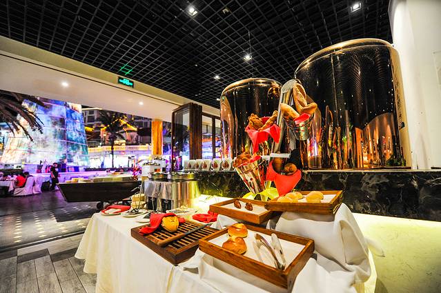 在泳池的池畔上一边游泳一边吃海鲜自助餐,这样的感觉是多么舒服啊?尤其是在严寒的冬季,来三亚这家池畔火锅吃海鲜的同时过着江南人无法想象的夏季,这才让人羡慕呢。