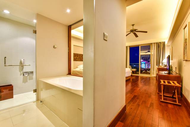由于山野君我考虑到了海棠湾是三亚最美也是最安静的海滩,所以这一次的避寒度假之旅就把海棠湾列入此次的行程之中了。久闻三亚海棠湾红树林酒店是国内第一家七星级酒店标准的度假酒店,与迪拜帆船酒店有几分相似之处的特征而吸引了我选择这家酒店,于是就预定了两个晚上的住宿。住宿期间非常的满意,无论是服务的专业性,还是硬件设施都非常好。酒店拥有自己的园林式花园、婚礼广场、海景观景餐厅以及私人沙滩。 我这次入住的房间是至尊海景房,房间的观景效果超级好,阳台很大,可以一边喝茶一边观海。站在阳台上整个蜈支洲岛和大海的海平线尽收眼底,感觉超赞,这与传闻中的七星级酒店很切贴的。 此外房间的设施非常好,舒服无比的床上用品之外,还有干湿分离的卫生间以及阳台外私密性极好的浴缸,感觉在这里住上几天都不嫌多,倘若不是时间问题我还准备在这里继续睡上一个多星期。山野君就大概稍微详细的与大家一起分享这家国内首家七星级海岛酒店的方方面面,以期对大家选择海棠湾红树林度假酒店有一定的参考性的帮助。