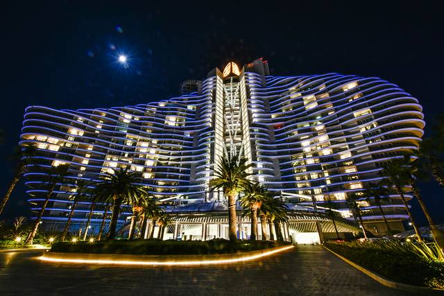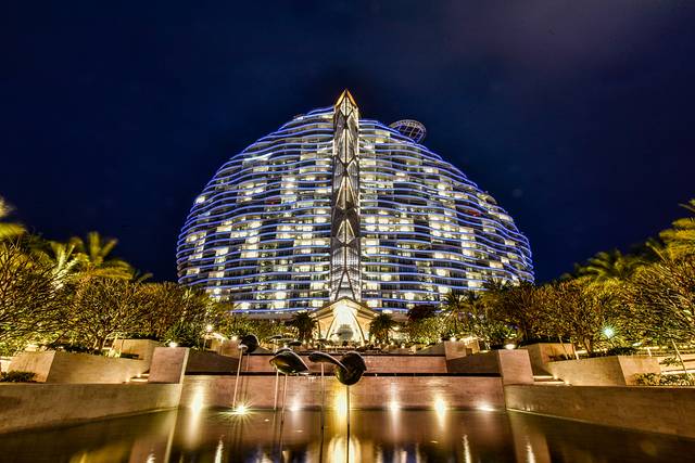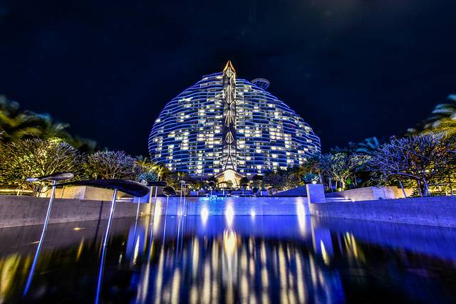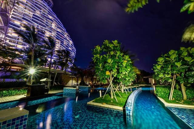 夜色下的海棠湾红树林酒店的外景可能更像迪拜帆船酒店了,这样的酒店设计是非常有视觉上的冲击力与感染力的。