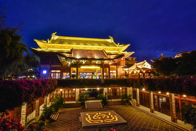 夜晚下的华宇度假酒店外观显得有一些古朴而典雅气息,这样的酒店的印象是比较不错的了。