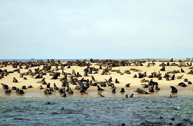 船前方出现一片陆地,是鹈鹕岬(Pelican Point)到了。这片沙滩上,有很多海狮,鹈鹕,火烈鸟和其他成群的小鸟。